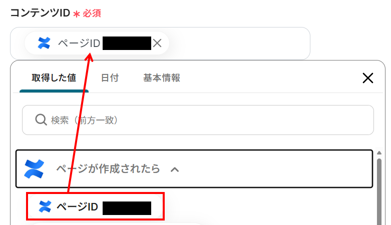 コンテンツIDは、Confluenceのトリガー設定で取得した値から「ページID」を選択しましょう。
