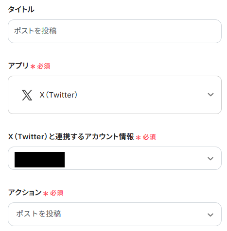 前のステップで取得した値から、X(Twitter)でポストを投稿する設定を行います。