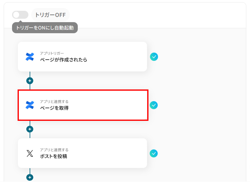 - Confluenceのトリガー設定およびページ取得設定、X(Twitter)のアクション設定