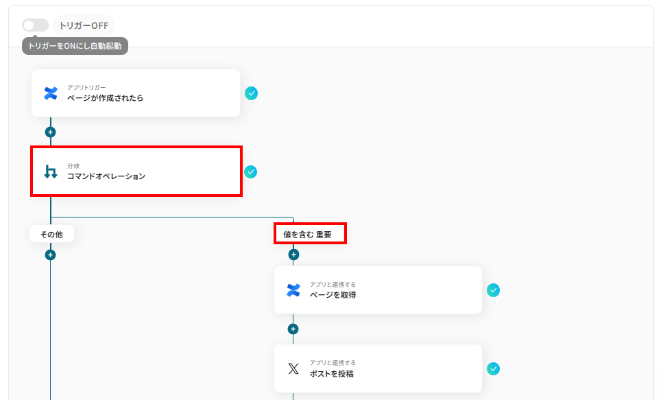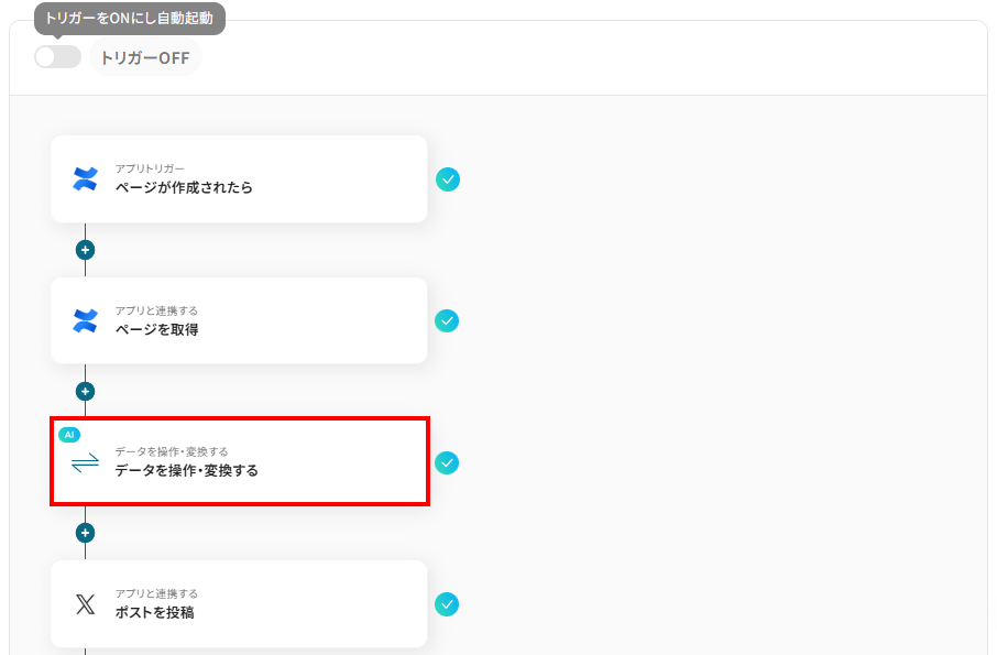 このワークフローを活用すれば、Confluenceにページが作成されるとAIが内容を自動で要約し、X(Twitter)へ投稿するまでの一連の流れを自動化し、情報発信の効率を高めます。