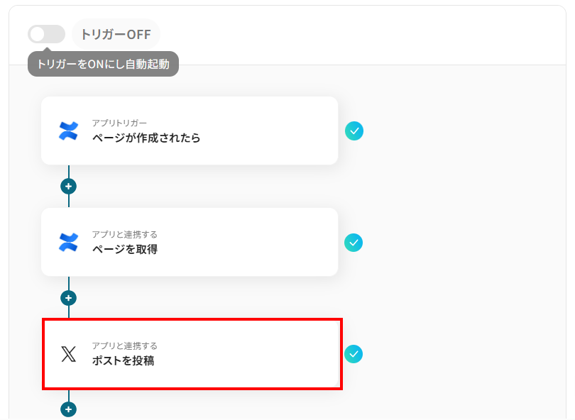 このワークフローを活用すれば、Confluenceでページを作成するだけで、その内容が自動でX(Twitter)に投稿されるため、情報共有の効率化と工数削減を両立できます。