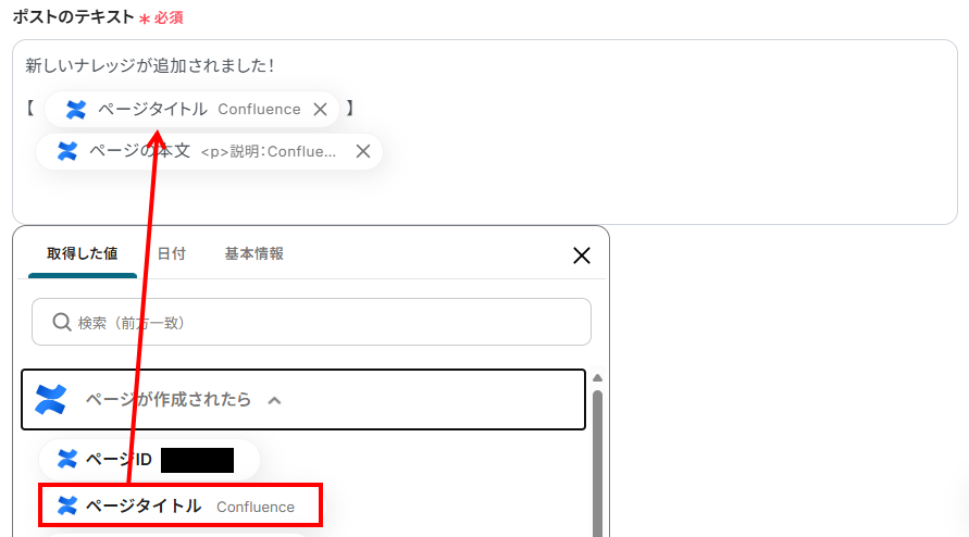 取得した値を使用して、次のように設定することで、Confluenceでページが作成されるたびにそのページIDを動的に取得できます。