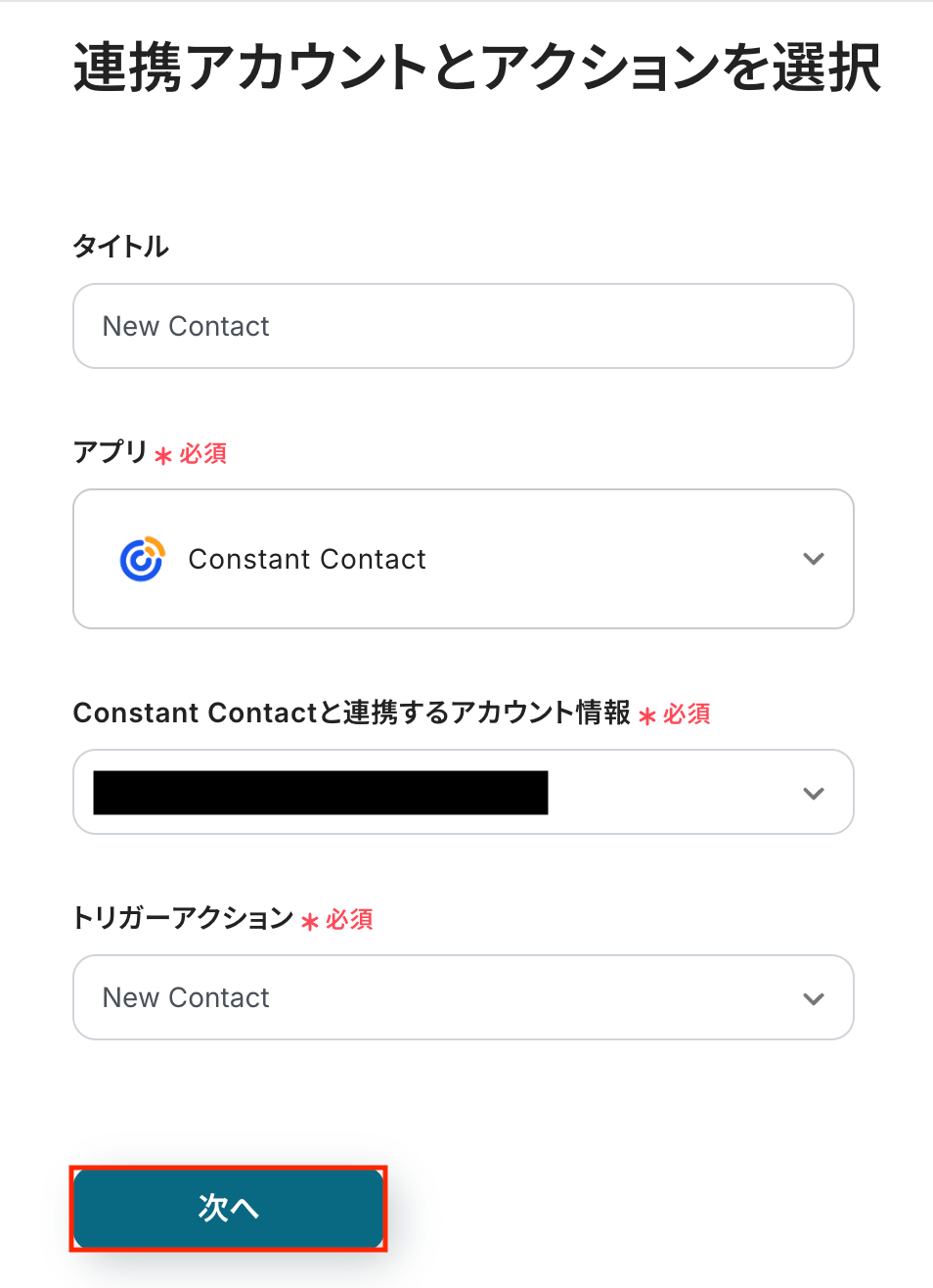 Constant Contactと連携するアカウント情報に問題がなければ、「次へ」をクリックします。