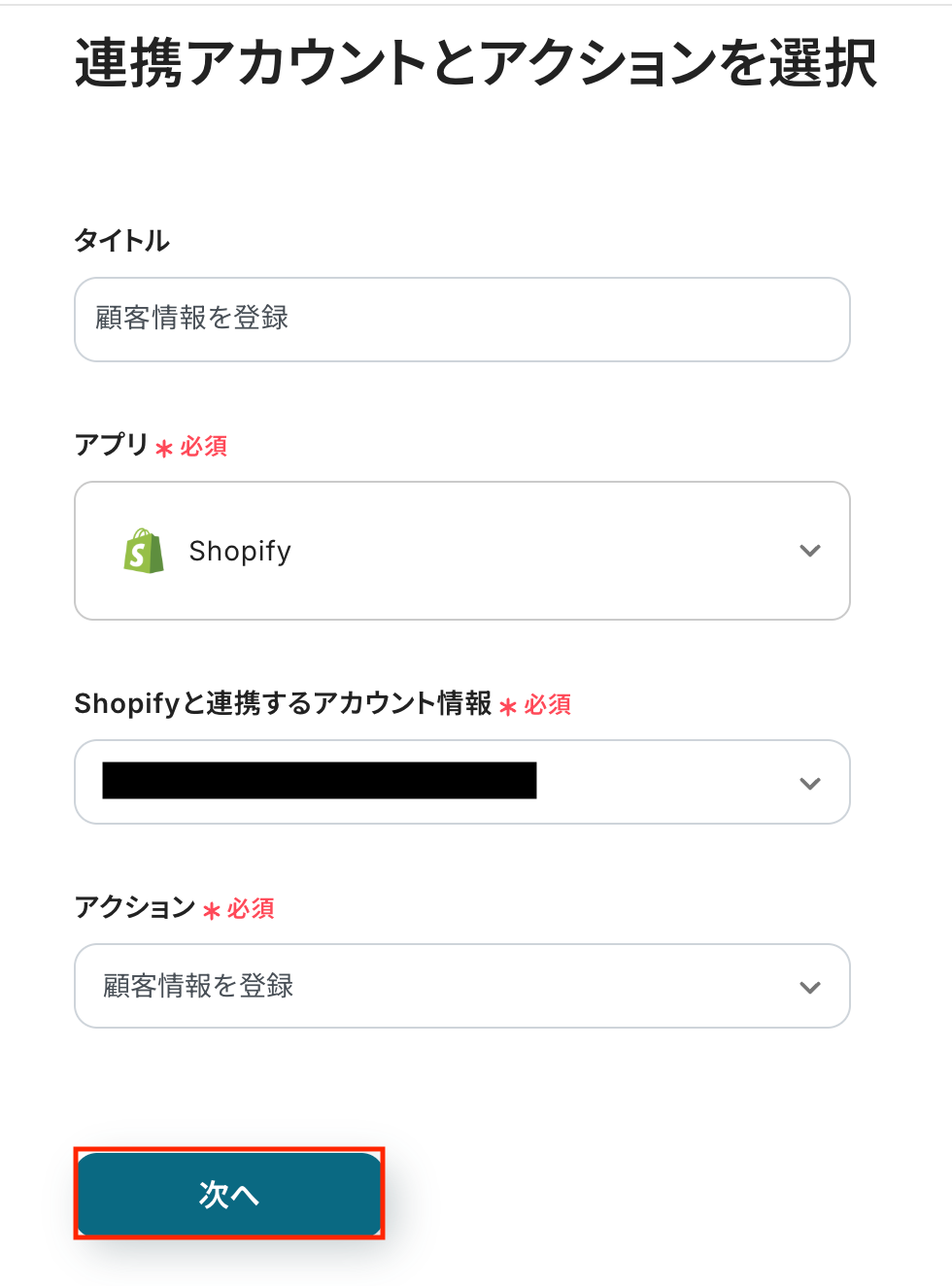 - Shopifyで顧客情報を登録するアクションを設定する際に、連携対象となるご自身のストア(サブドメイン)を任意で設定してください。