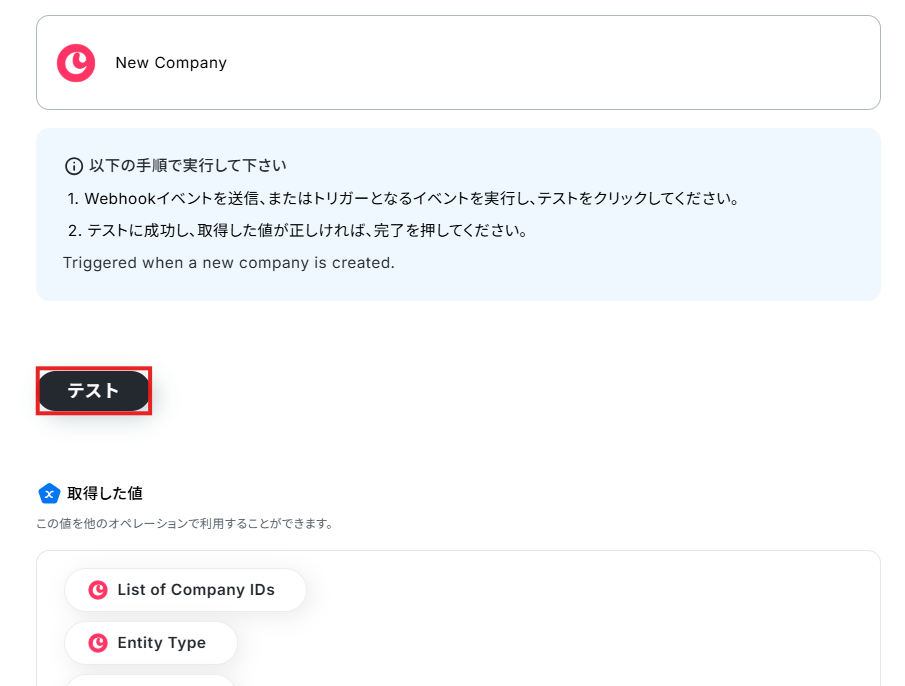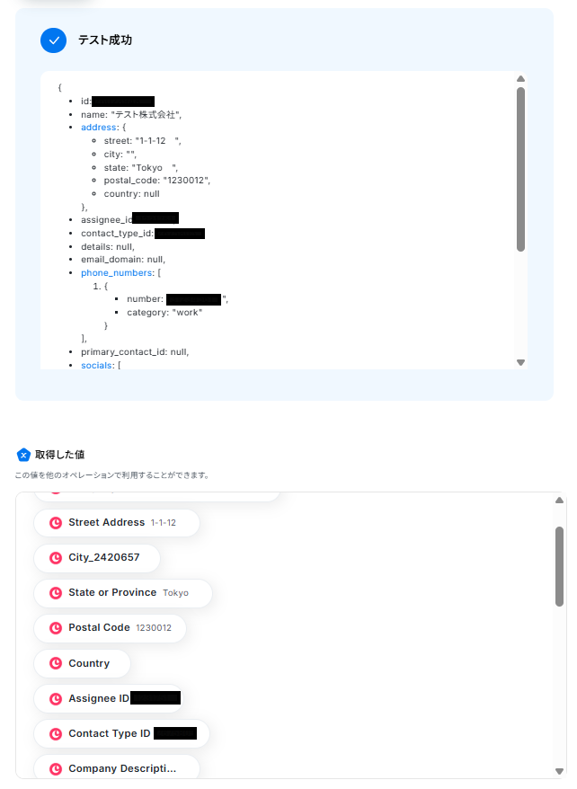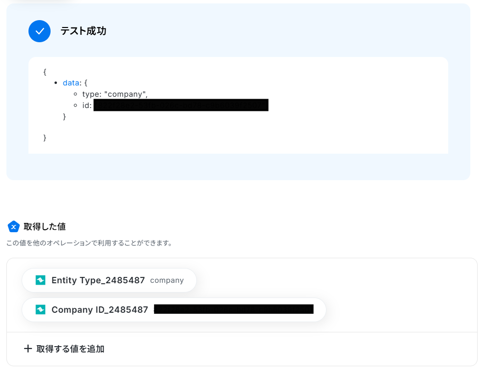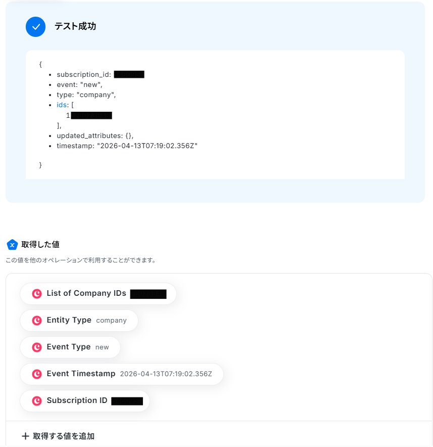 テストに成功すると、「取得した値」に情報が追加されます。 ※取得した値とは 設定時の「テスト」で取得した値のことです。後続ステップの入力値として利用でき、実行のたびに最新の内容で反映されます。
