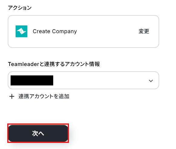 ステップ5:TeamleaderにCompanyを追加する設定 次にTeamleaderにCompanyを追加するアクションを設定していきます。