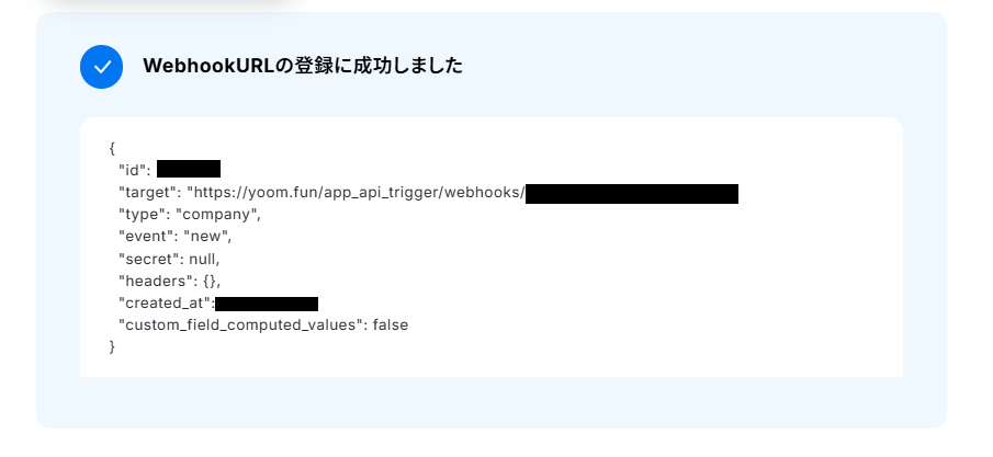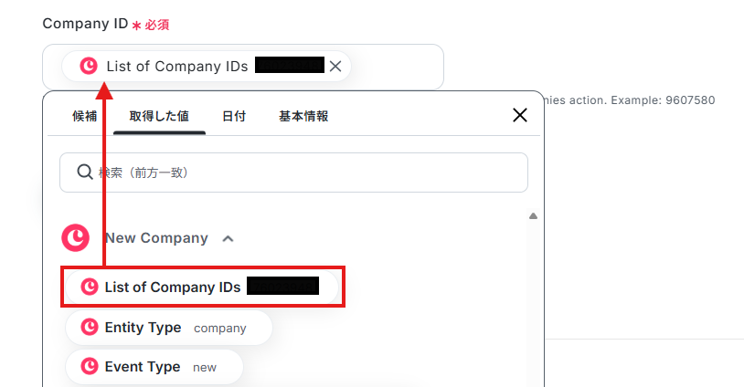 Company IDは以下のように取得した値から設定します。 取得した値を活用することで、固定値ではなく、トリガーが実行されるたびに最新の情報を反映できます。 デフォルトで設定されていますが、【←トリガーで取得した値を引用してください】という補足文は削除して設定してください。