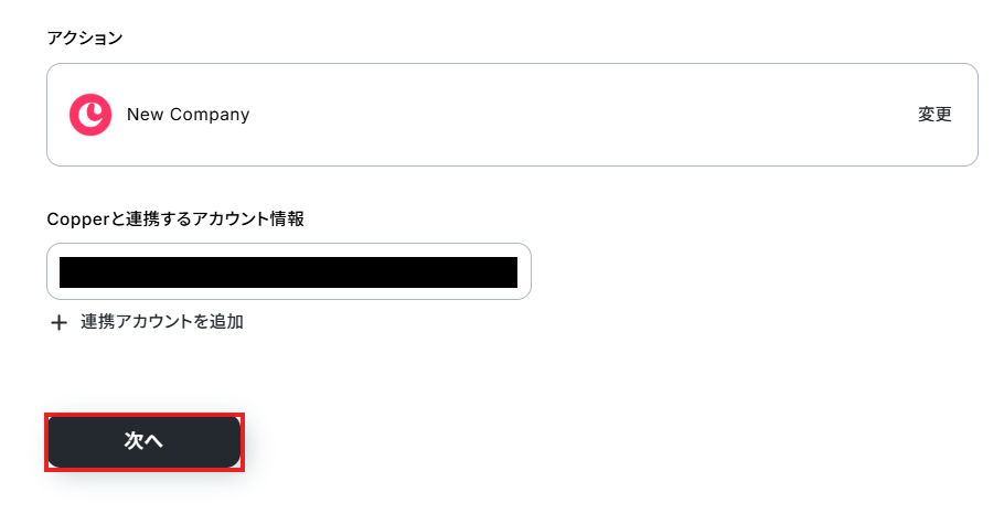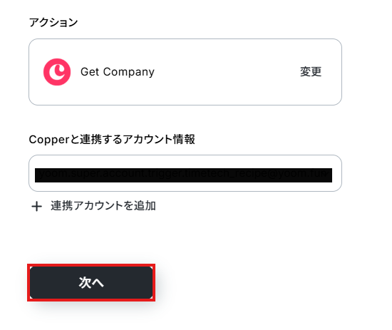 ステップ4:Copperの会社情報を取得する設定 次にCopperで会社情報を取得するアクションを設定していきます。