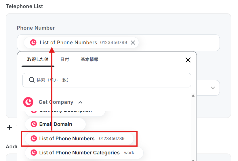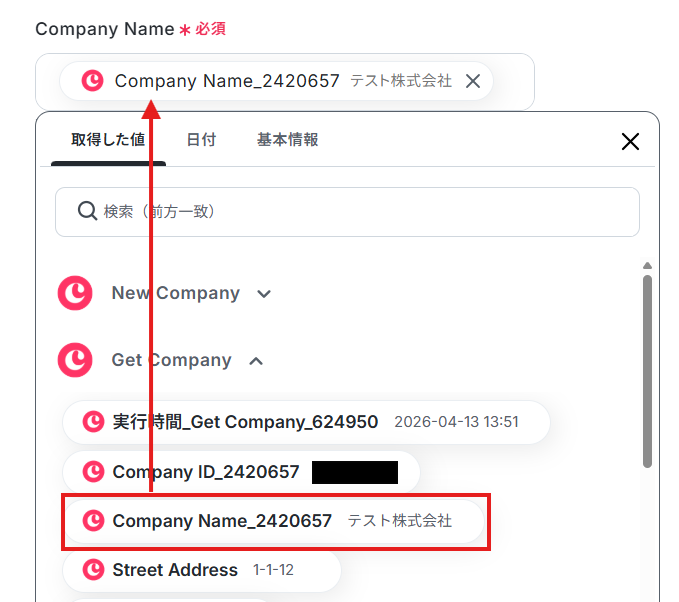 各項目に該当する取得した値を設定していきます。 デフォルトで設定されている項目もありますが、【←「Get Company」で取得した値を引用してください】は削除してください。