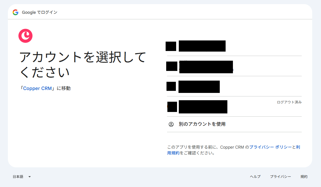 【Copperのマイアプリ登録】 Copperの連携アカウントを追加をクリックすると以下のようなログイン画面に遷移します。 今回はGoogleで連携するため、「sign in with Google」をクリックします。