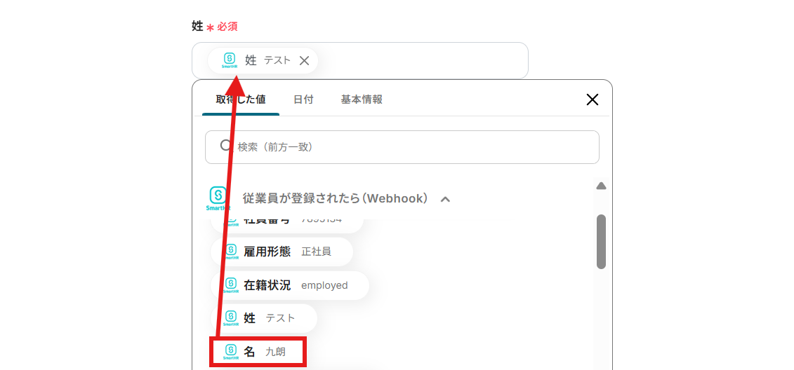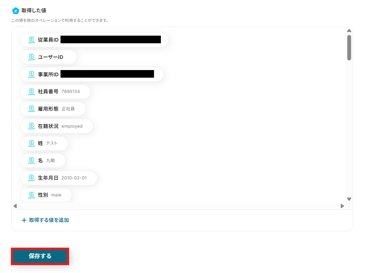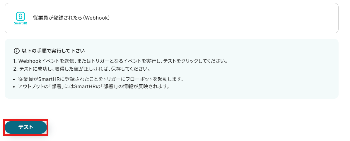 テストが正常に完了すると、「テスト成功」の画面が表示され、SmartHRから取得した情報を引用できるようになります。