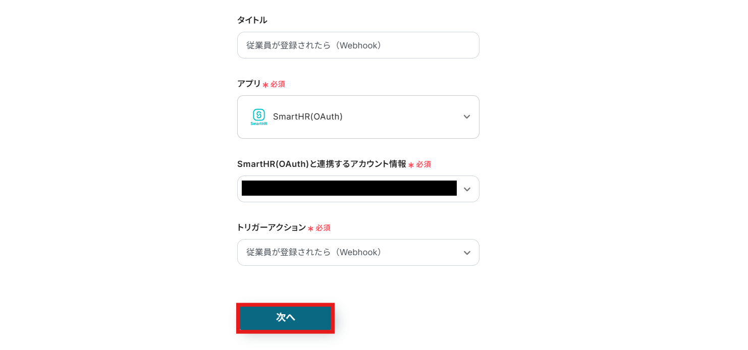 タイトルは、必要であればわかりやすいものに変更し、トリガーには「従業員が登録されたら(Webhook)」のまま次に進みます。