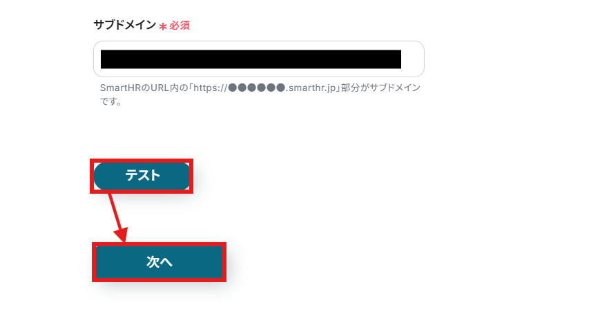 マイアプリ連携の際に入力したものと同じです!こちらの記事も参考にしてみてください。入力したらテストをクリックし、問題がなければ「次へ」をクリックしましょう。