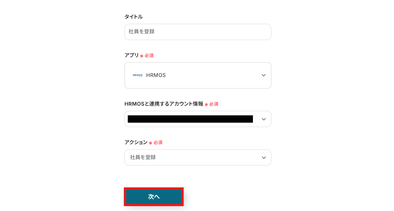 先ほどと同様にHRMOSと連携するアカウント情報やアクションを確認、タイトルを修正して次に進みましょう。