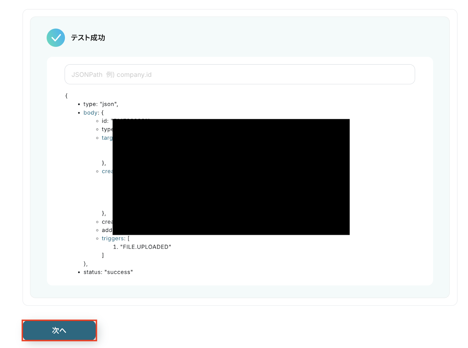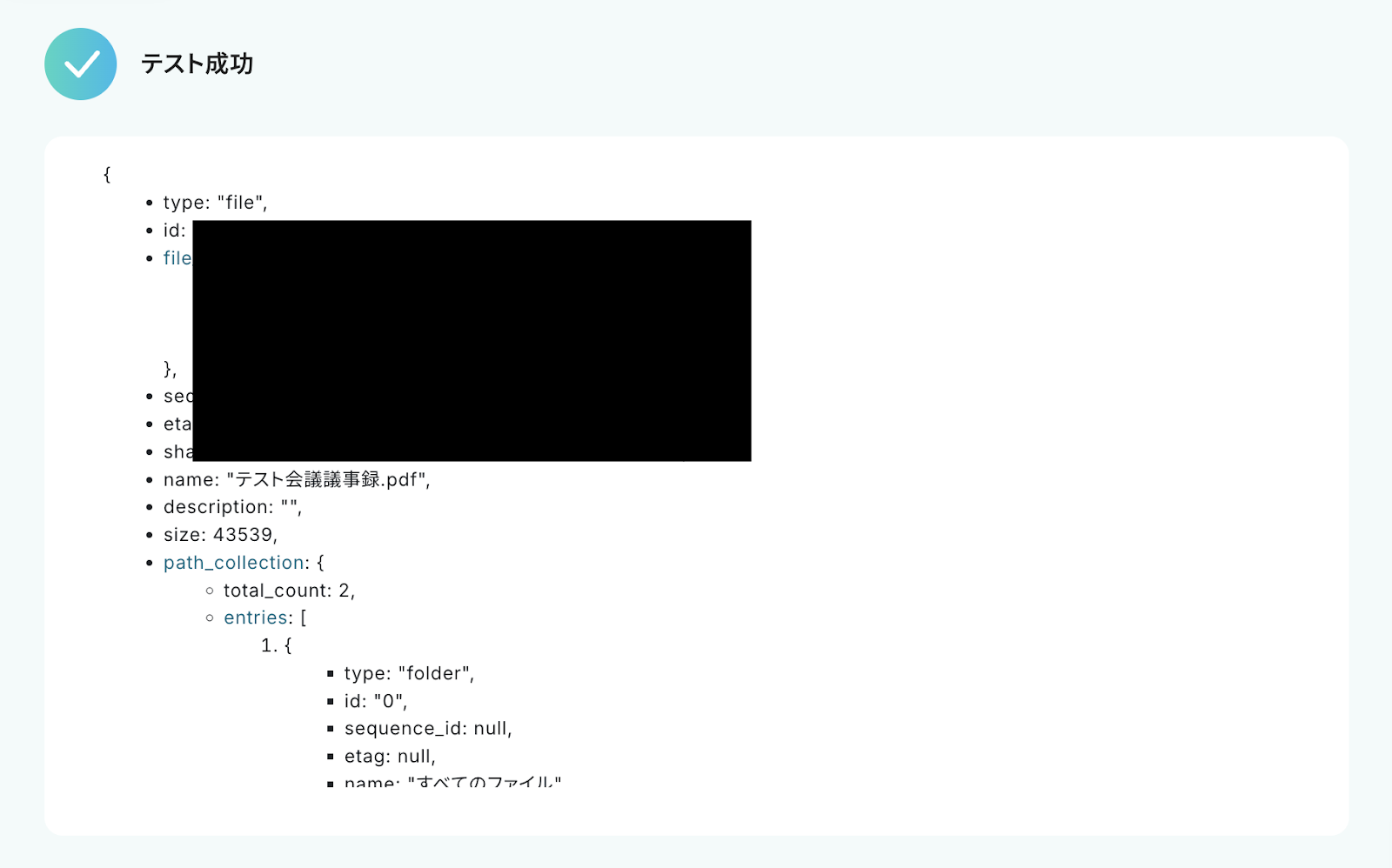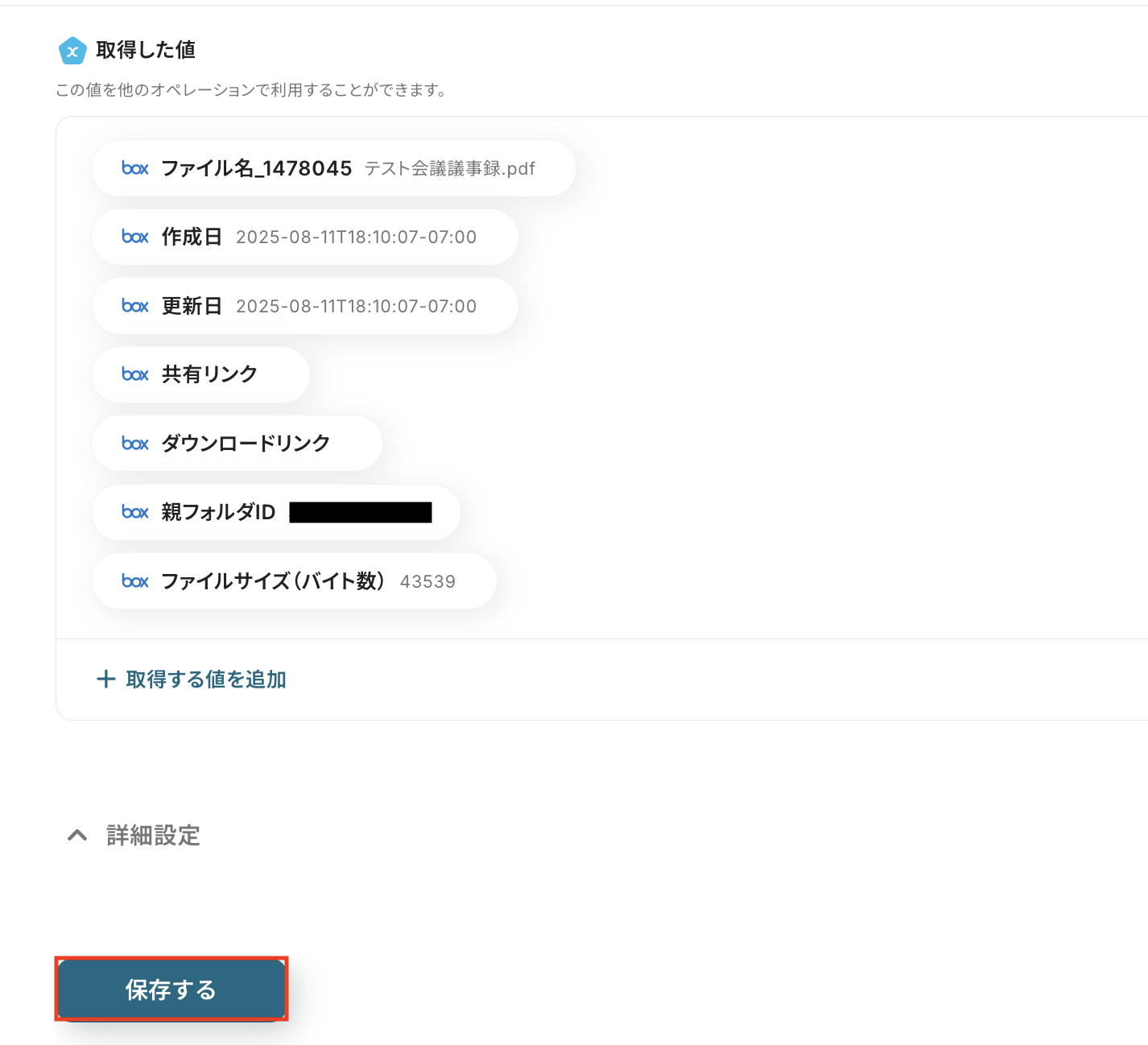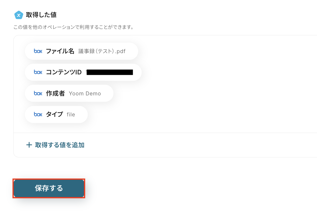 テストに成功すると、Boxにアップロードしたファイルに関する情報が一覧で表示されます。 以下の取得した値 は後続のステップで利用可能です。