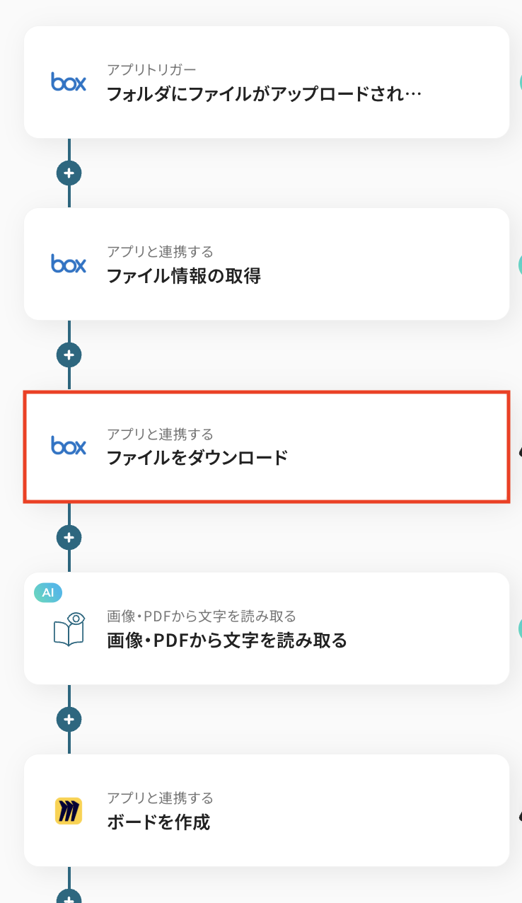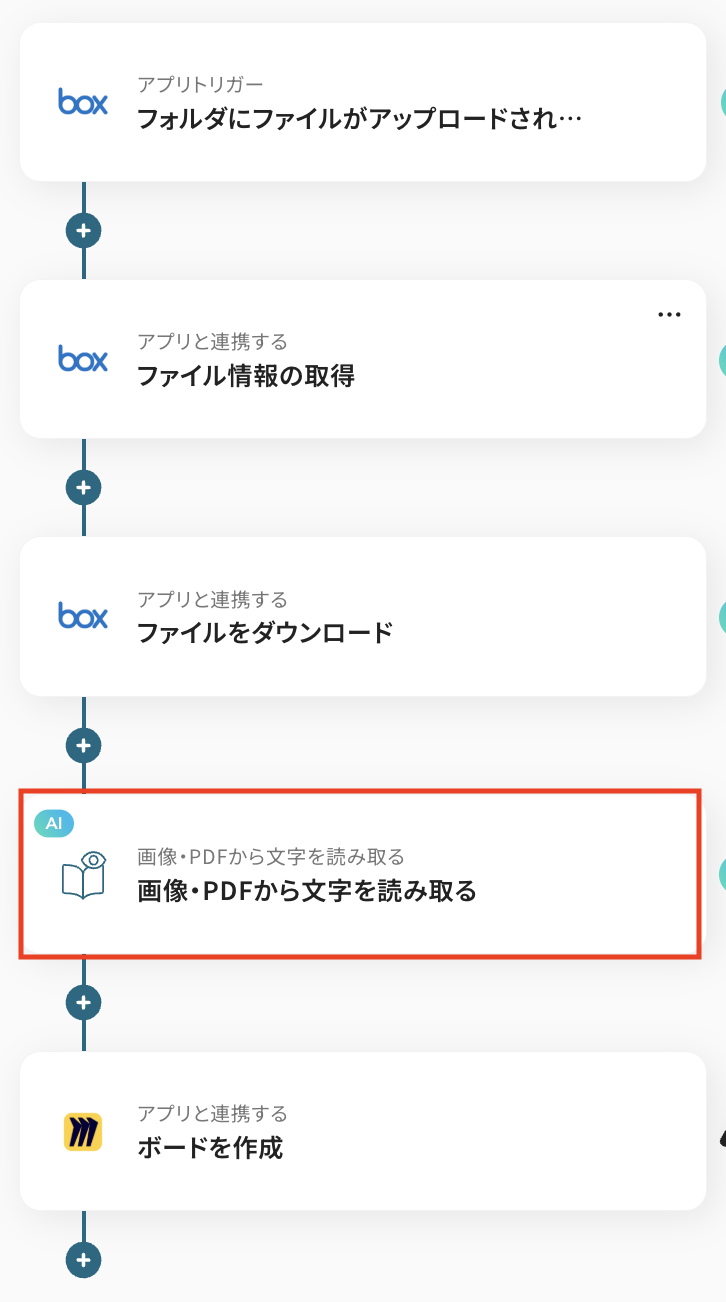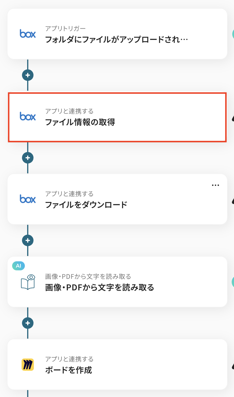 トリガーをONにすることで、Boxにファイルがアップロードされたタイミングで、OCR機能によってファイル内容を自動で読み取り、その情報をもとにMiroへボードが自動作成されるようになります。