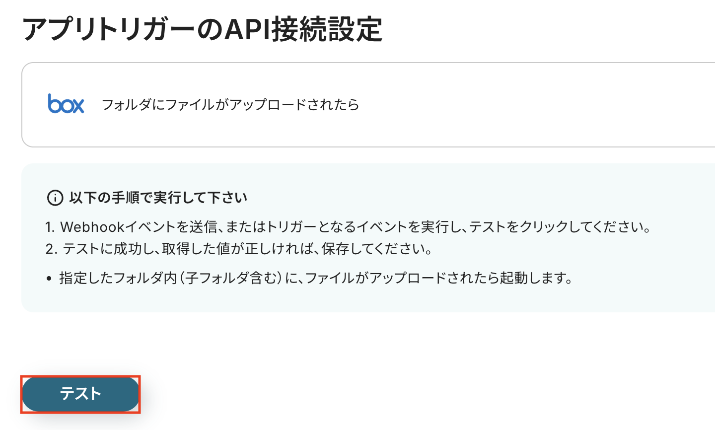入力後、正しくトリガーが動作するかを確認するため「テスト」をクリックします。 なお、テストが成功しない場合などのエラー時には、下記ページをご参照ください。