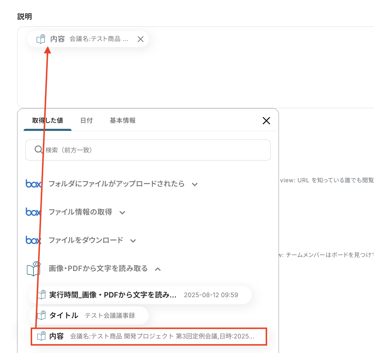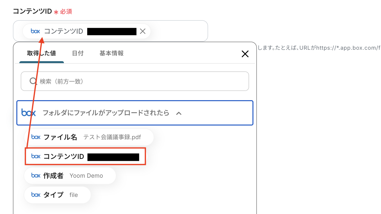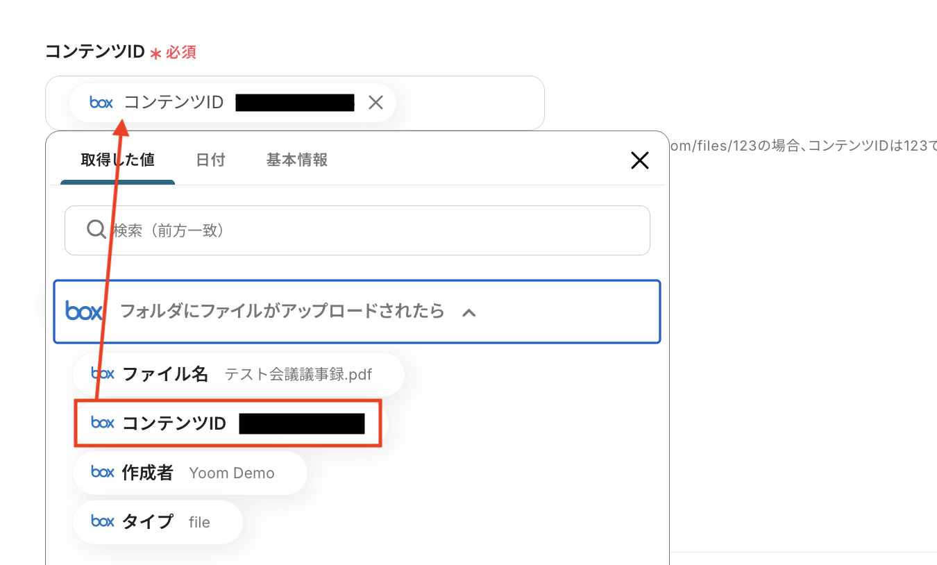 コンテンツID 入力欄をクリックすると、前のステップでBoxから取得済みの値が表示されるので、選択して入力しましょう。