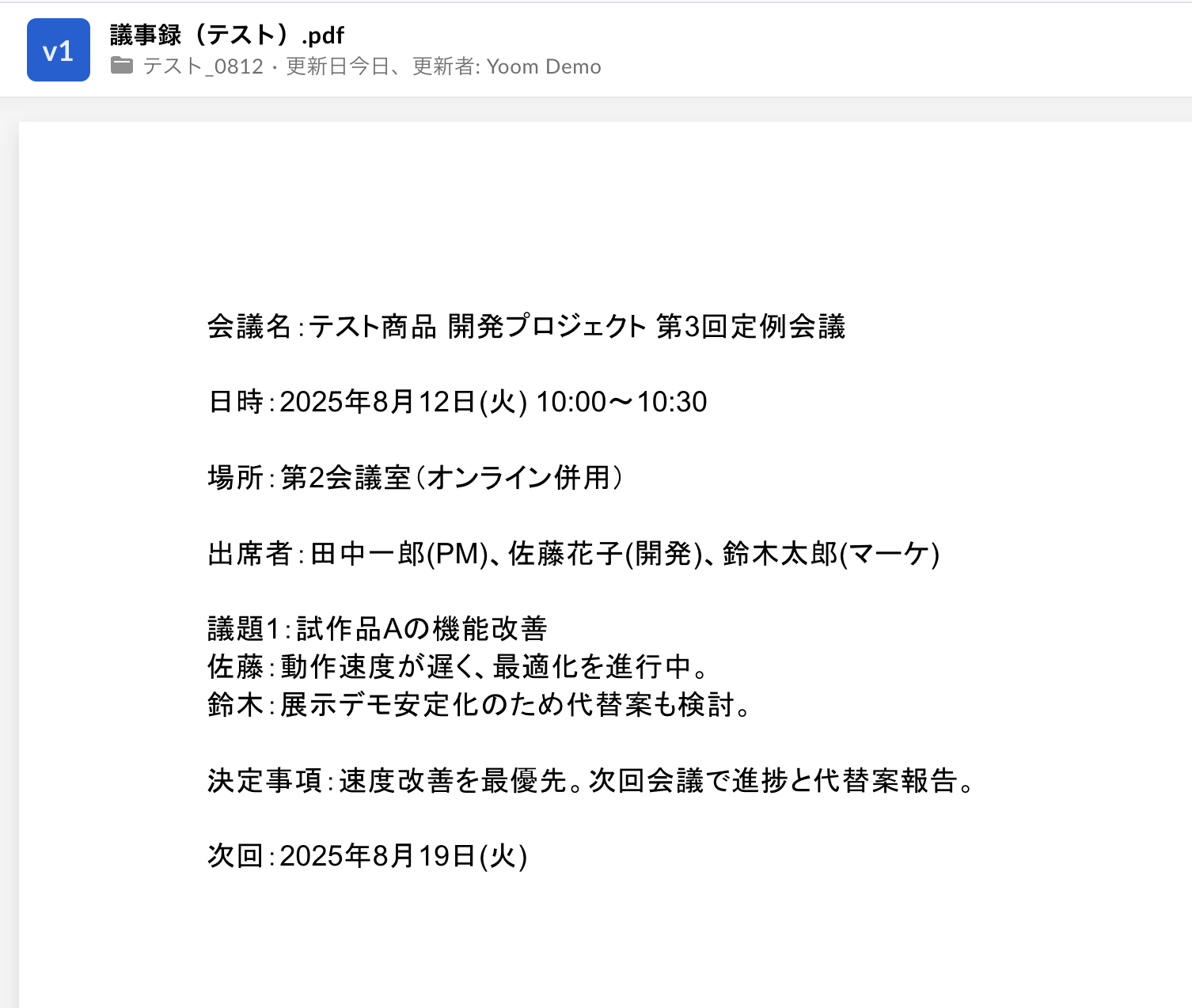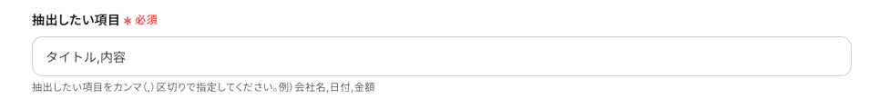 抽出したい項目 対象のテキストから抽出したい項目をカンマ区切りで入力してください。 今回はテスト用にアップロードした議事録ファイルから、会議のタイトルと議事内容(内容)を抽出してMiroのボードに反映させたいので、デフォルトで設定されている 「タイトル,内容」 のまま設定しています。