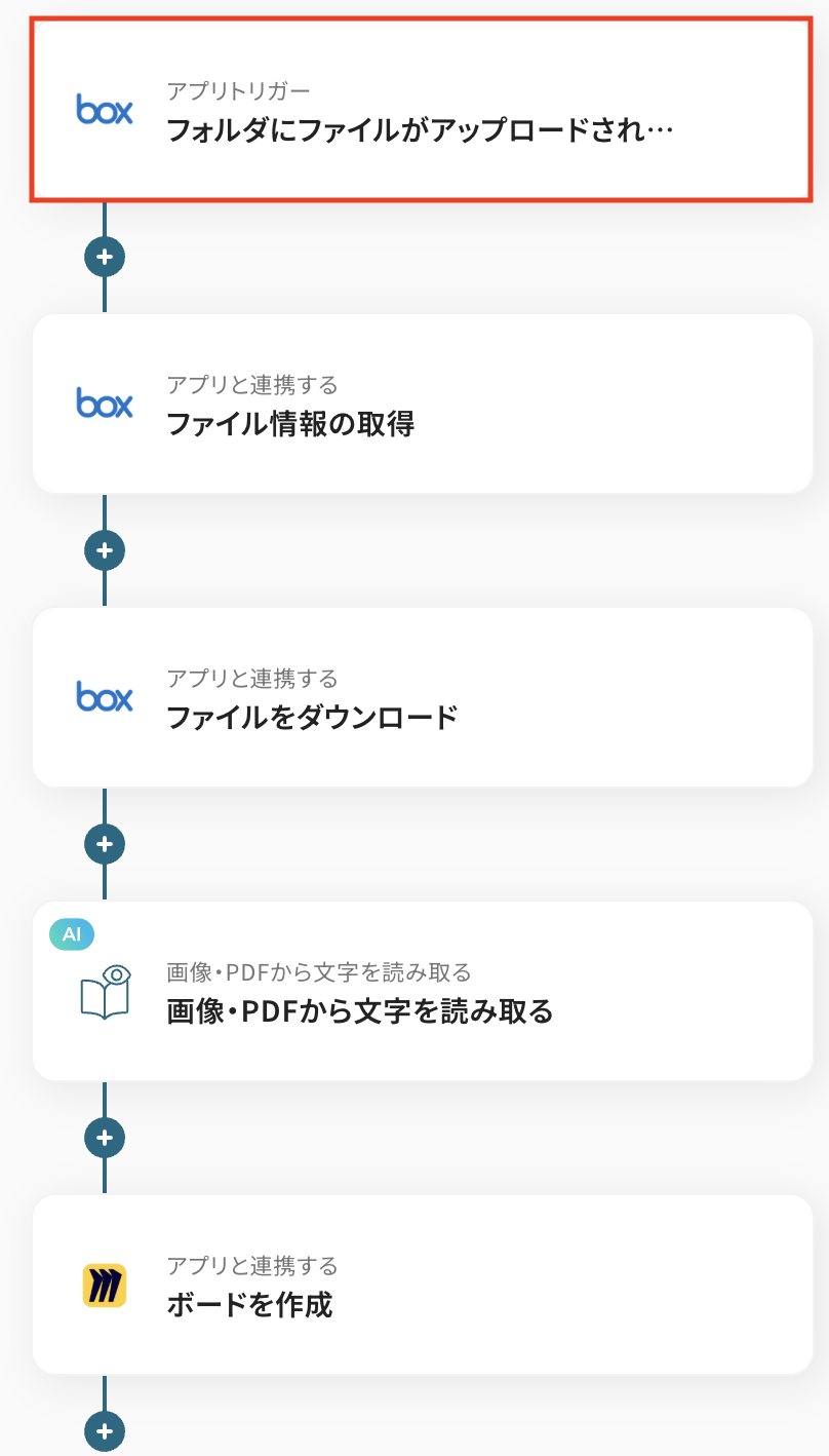 今回は「BoxにファイルがアップロードされたらOCRで読み取り、Miroにボードを作成する」 フローを作成していきます!