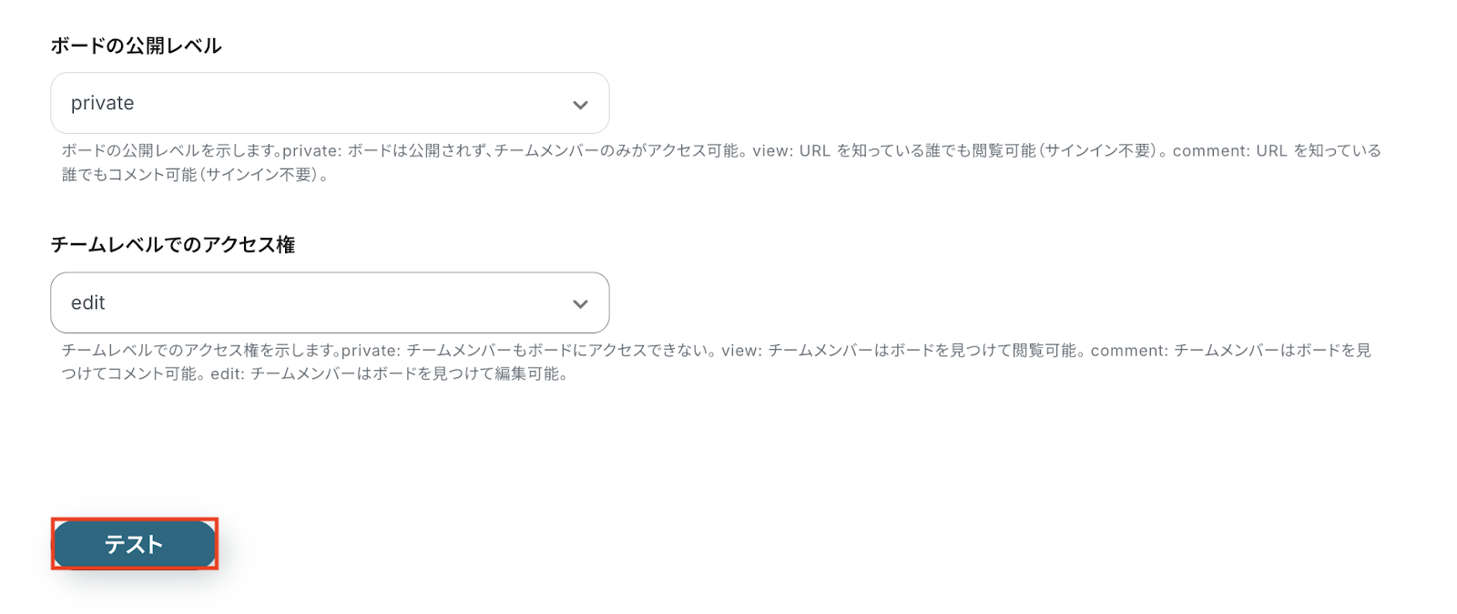 チームレベルでのアクセス権 それぞれ注釈に沿って設定してください。 この設定を行わずにテストを実行するとエラーが発生するため、必ず設定を行いましょう。
