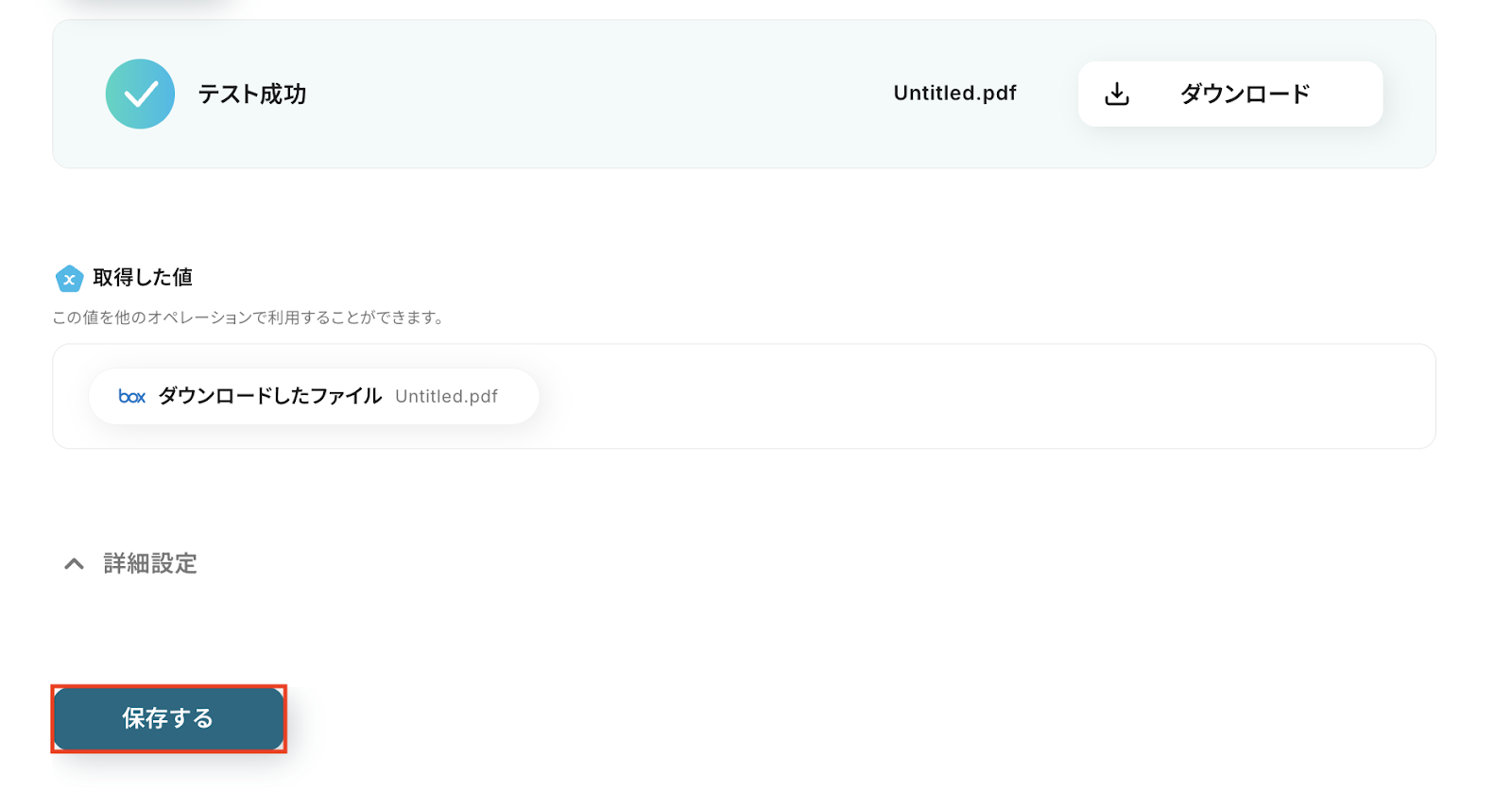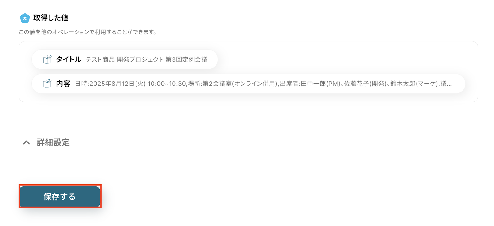 以下の画像の『取得した値』を後続のステップで利用可能です。 内容を確認し、「保存する」をクリックします。