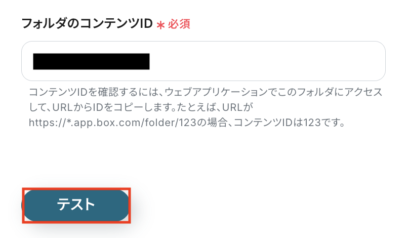 フォルダのコンテンツID 今回の連携でファイルをアップロードするフォルダを設定します。 注釈に沿って入力してください。
