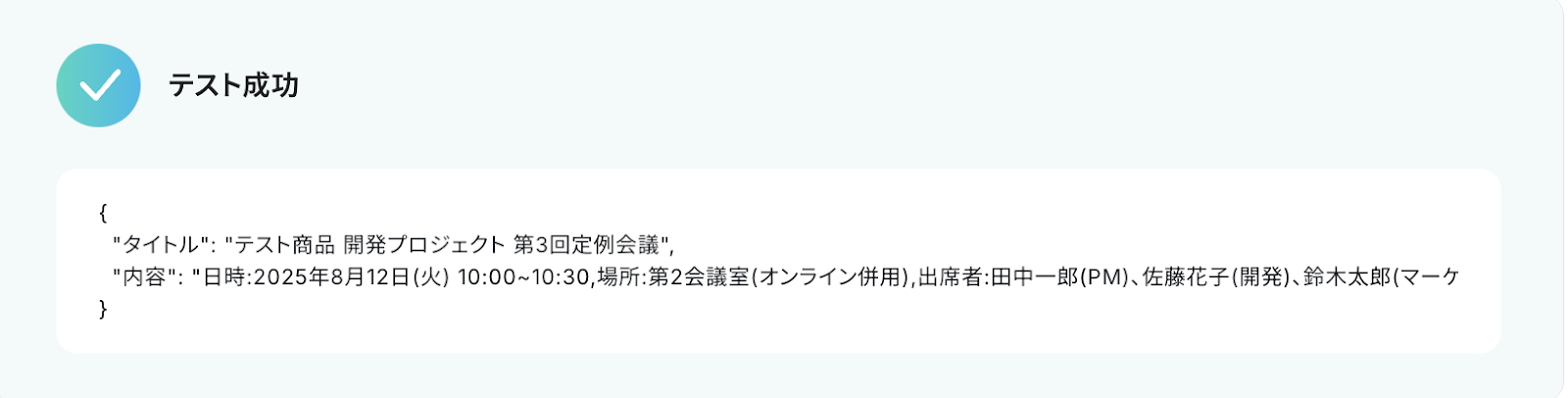BoxとYoomのWebhook連携が正しく機能すると「テスト成功」のメッセージとレスポンスが表示されます。