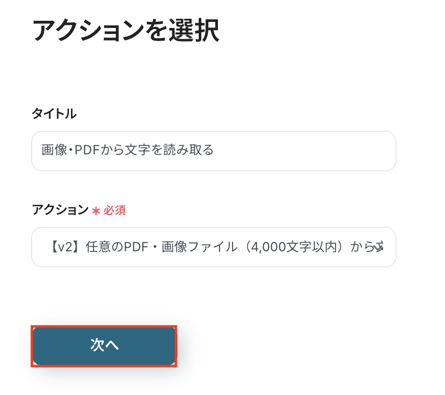 デフォルトで 「[v2] 任意のPDF・画像ファイル(4,000文字以内)から文字情報を読み取る(5タスク)」 が選択されていますので、そのまま使用します。 確認後、「次へ」 をクリックします。