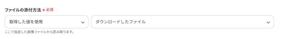 ファイルの添付方法 前のステップ(ファイルダウンロード)で取得したデータがデフォルトで設定されているため、そのまま使用します。