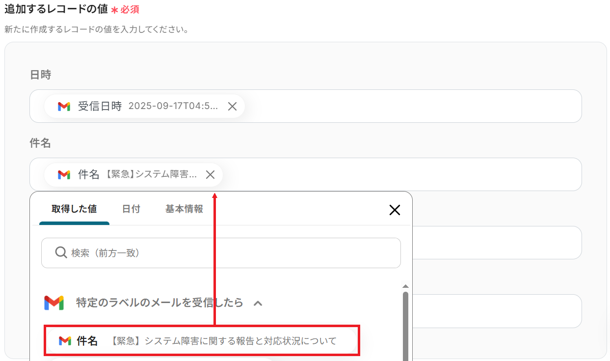・件名/本文:任意の値を入力します。これまで同様に②で取得した値を埋め込むことも可能です。