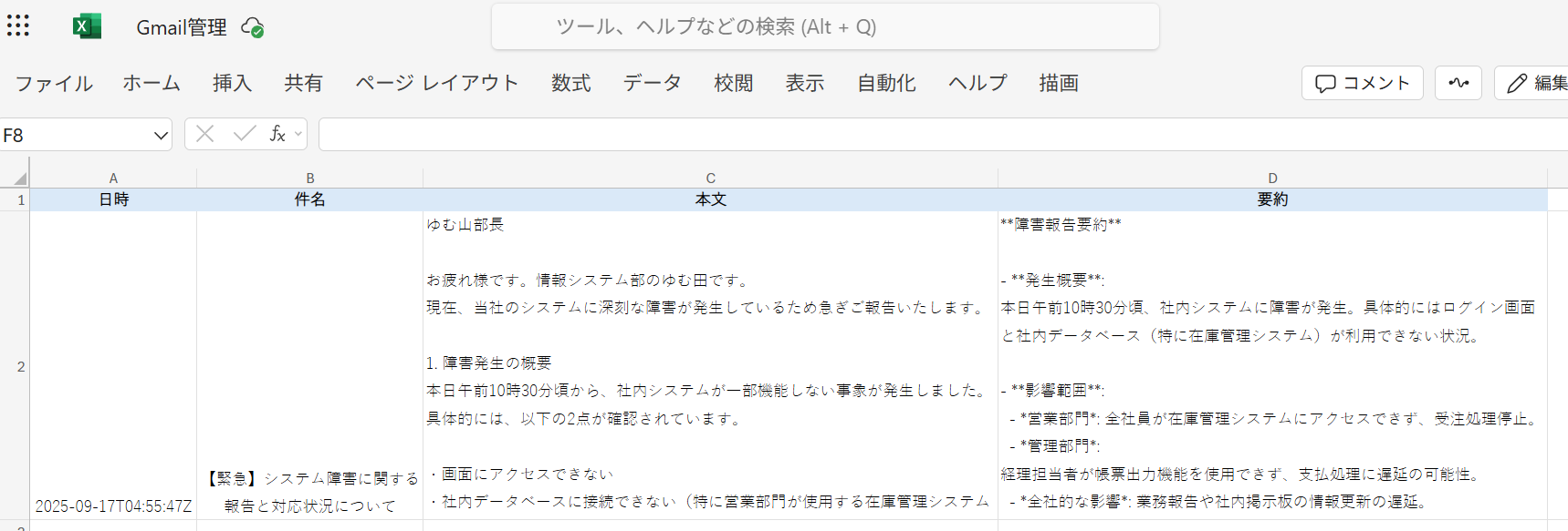 Gmailの内容とDifyによる要約が、用意したシートに自動で追加されました!