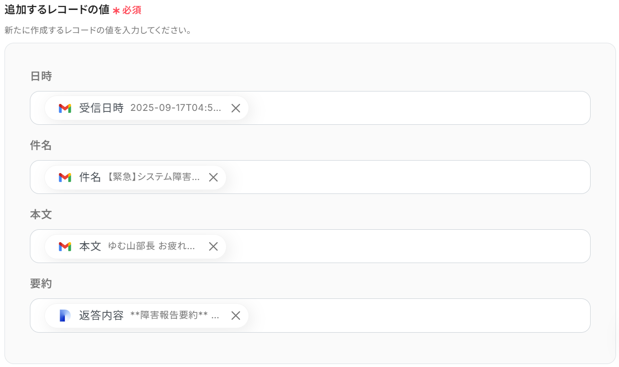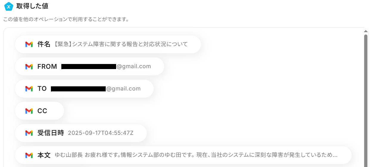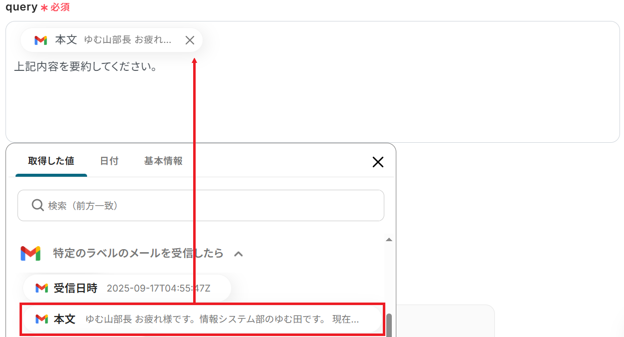 ※以下のようにGmailの「本文」のアウトプットを設定することで、トリガーが実行されるたびに最新の情報を反映できます。