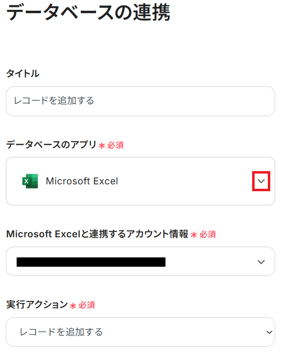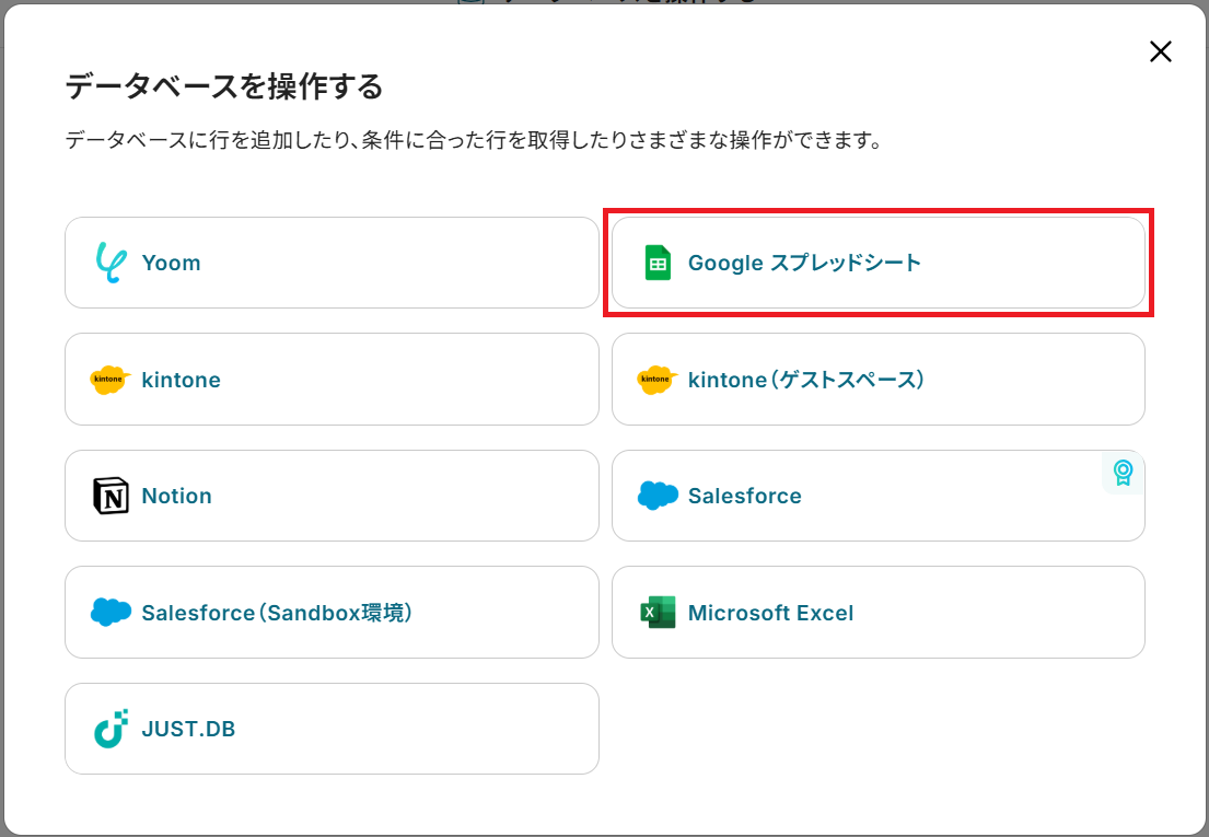 A:はい、可能です。今回ご紹介したテンプレートで変更するには、Microsoft Excelのアクションをクリックし、データベースの連携画面から、以下の赤枠をクリックします。Google スプレッドシートを選択後、実行アクションを「レコードを追加する」に変更して設定してください。