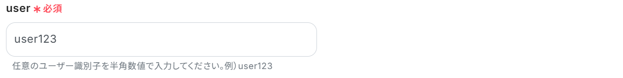 Difyのuserは指定のものはなく、user123のような任意のユーザー識別子を半角数値で入力するとその識別子を使ったuserとして処理されます。