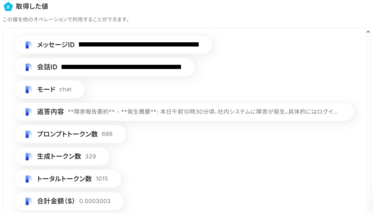 以下のようにGmailやDifyから取得したアウトプットを選択すると、受信内容や要約を変数として反映させることができます。