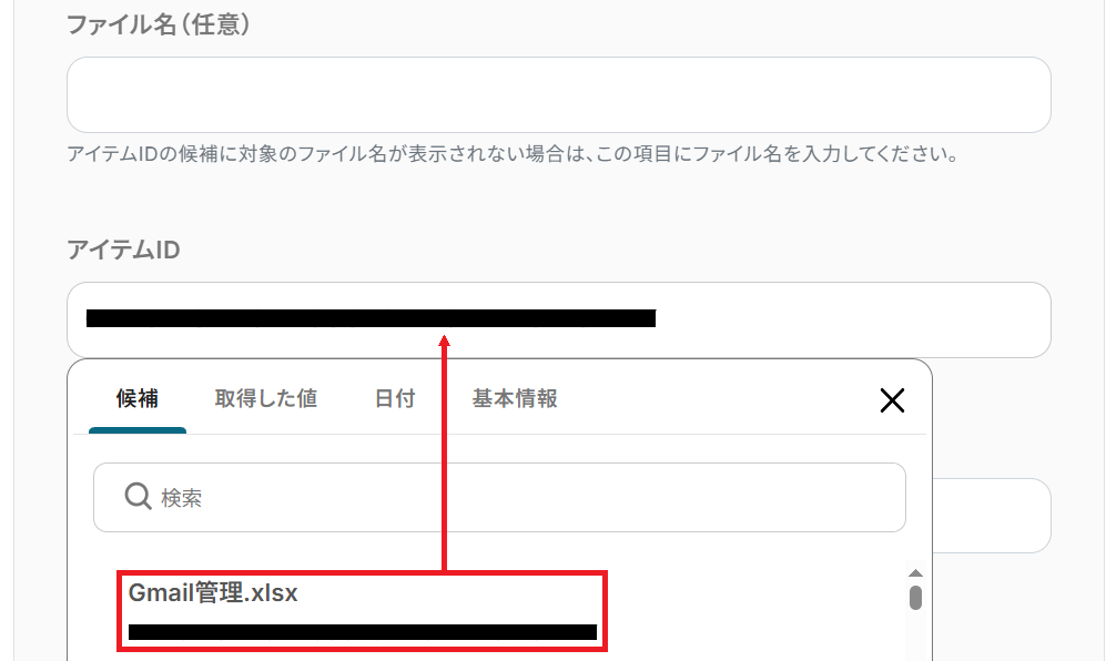 ・ファイル名(任意):アイテムIDにアイテムが表示されない場合は、こちらにファイル名を入れて再度アイテムIDを選択してください。