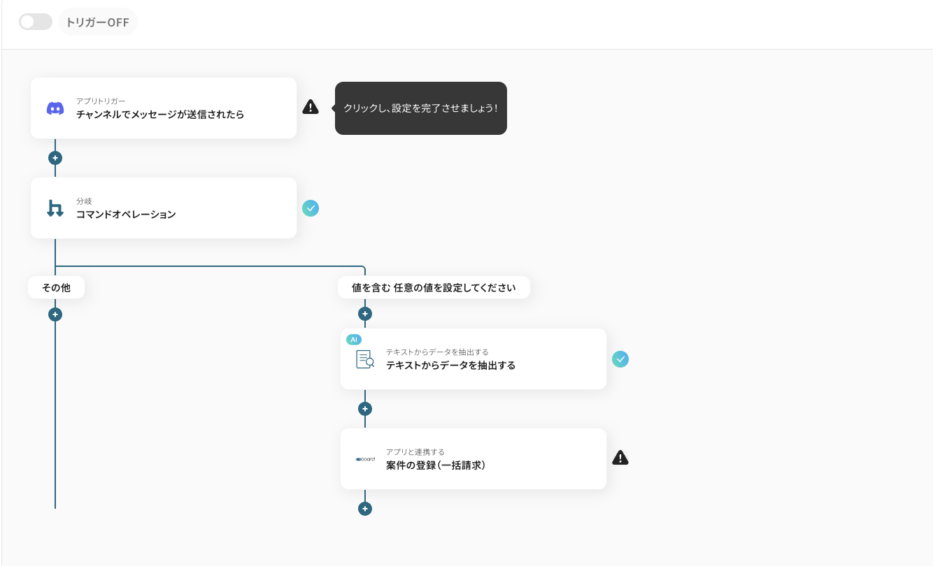 このワークフローは、Discordの特定チャンネルに投稿されたメッセージをきっかけに、boardへ一括請求の案件を自動で登録します。