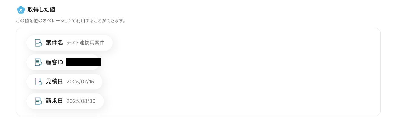 アウトプット情報は、「この値を他のオペレーションで利用することができます。」という注釈の通り、この後のステップで引用・活用できます。