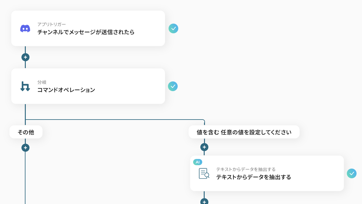 - Discordのトリガー設定および分岐の設置、続くテキスト抽出とboardのアクション設定
