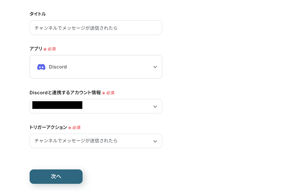 トリガーとなる「チャンネルでメッセージが送信されたら」をクリックして、連携するアカウント情報を入力してください。