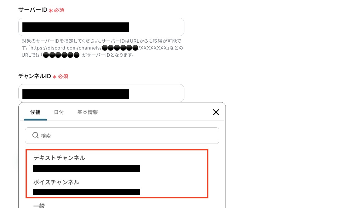 サーバーIDを正しく入力すると、チャンネルIDの情報は『候補』から引用可能となります。