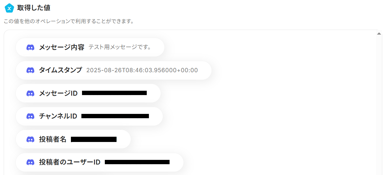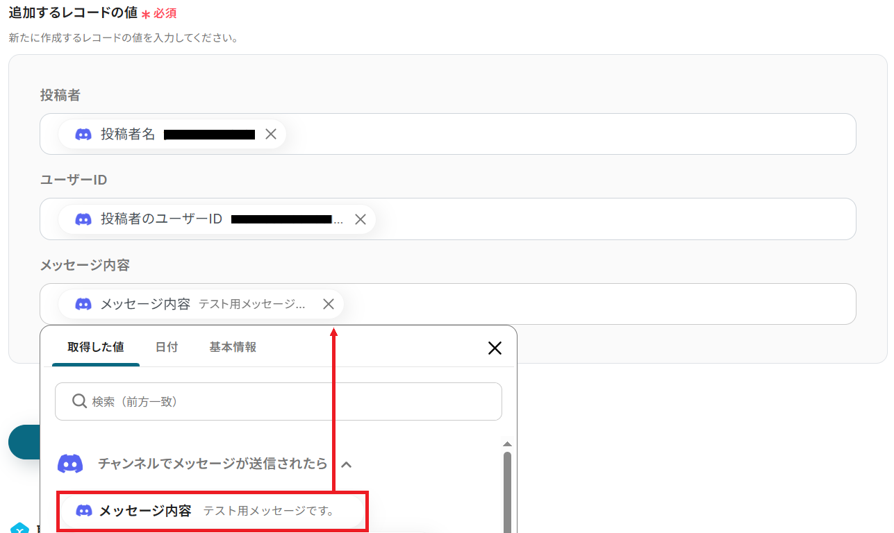 以下のようにDiscordから取得した値を選択すると、投稿内容を変数として反映させることができます。