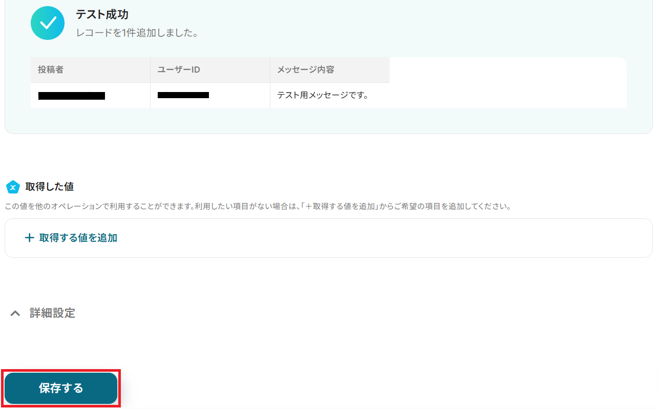 成功したら保存しましょう。ここで『取得した値』は次のステップで活用します。