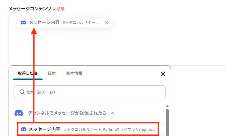 メッセージコンテンツには以下のようにDiscordから取得した値を用いて、メッセージ内容を入力しましょう。