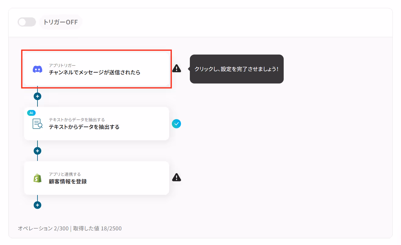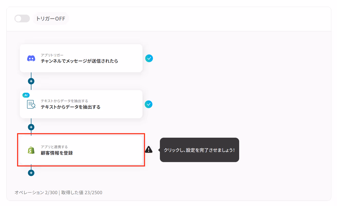 この記事では、先程ご紹介した「Discordに投稿されたメッセージをもとに、Shopifyに顧客情報を登録する」テンプレートを使ってフローを作成します。