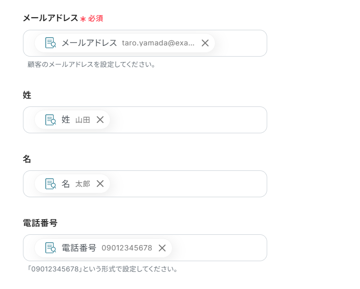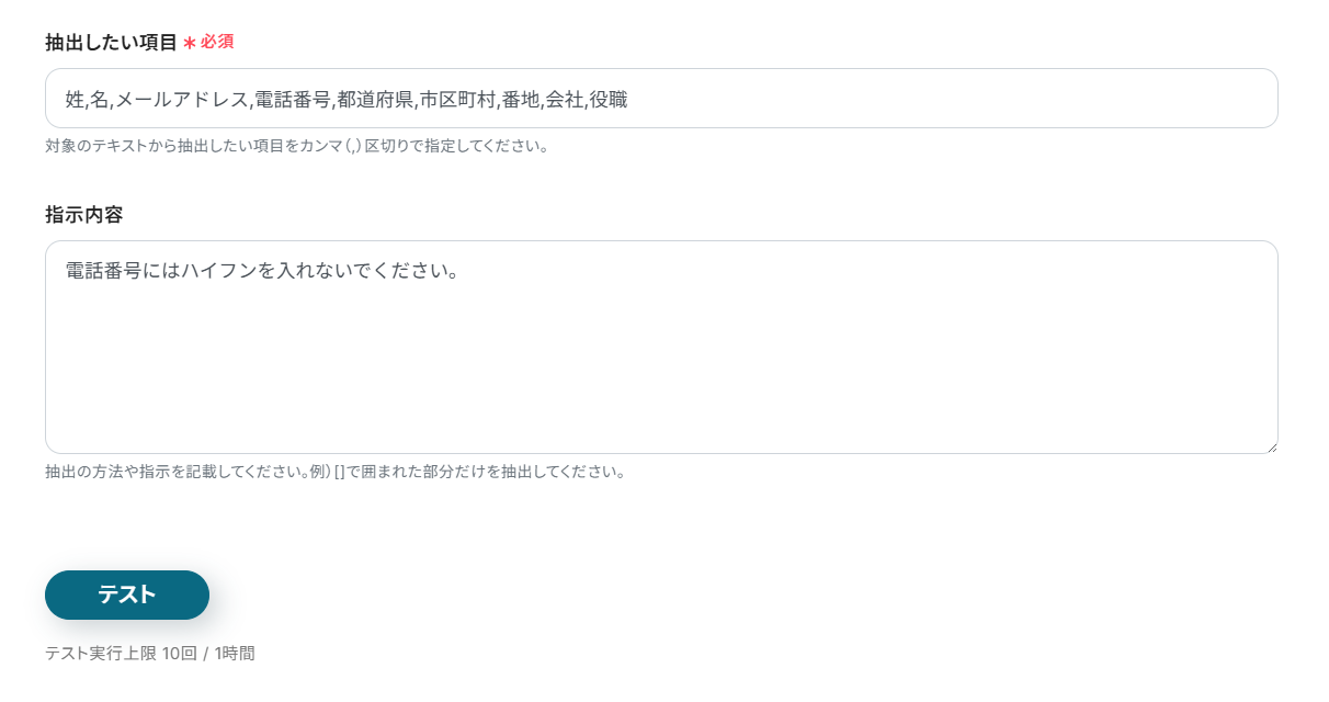 「担当者名から氏名を抽出してください」や「会社名の例:株式会社○○」などの情報の具体化や、「建物名は除外します」などの不要な情報の除外も有効です。