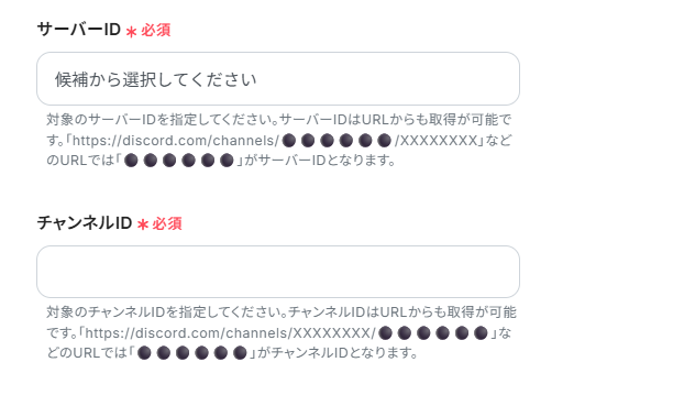 サーバーID、チャンネルIDをDiscordのURLで確認して入力します。