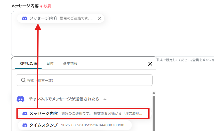 メッセージ内容には、以下のようにDiscordから取得した値からメッセージ内容を入力します。