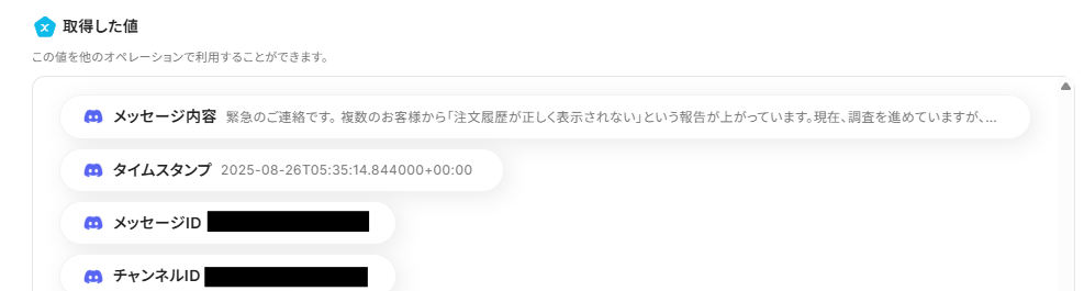 ※取得した値を用いて以下のように設定することで、Discordに投稿されるごとに他チャンネルへの通知へ異なるメッセージが動的に反映されます。